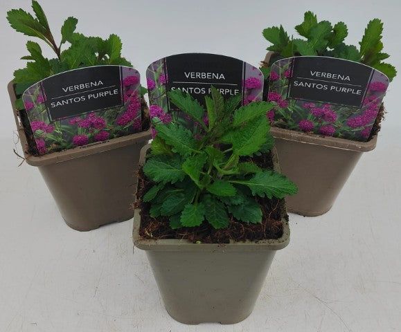 Verbena 'Santos Purple' is a variety of verbena known for its vibrant purple flowers. This plant is often used in gardens and landscaping due to its ability to attract butterflies and other pollinators. It's generally a hardy perennial or annual, depending on the climate, and is known for its drought tolerance and ability to thrive in full sun.